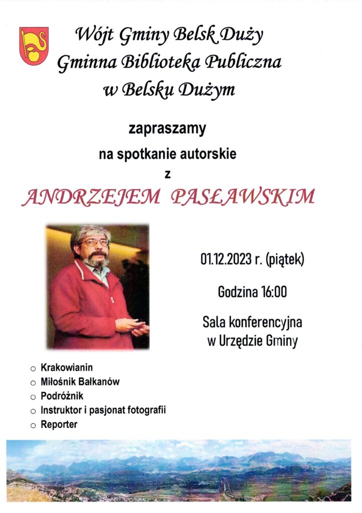 Wójt Gminy Belsk Duży – Władysław Piątkowski oraz Gminna Biblioteka Publiczna w Belsku Dużym zapraszają na spotkanie autorskie z Andrzejem Pasławskim.