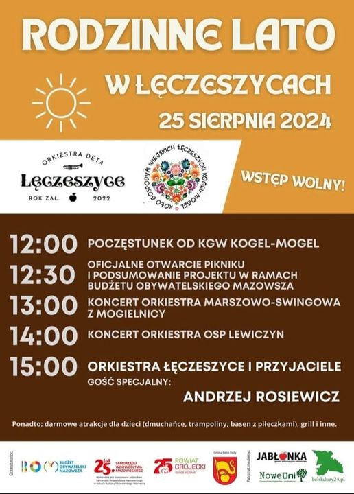 Orkiestra Dęta Łęczeszyce oraz Koło Gospodyń Wiejskich “Kogel Mogel” zapraszają na Rodzinne Lato w Łęczeszycach. Odbędzie się ono w niedzielę, 25 sierpnia!