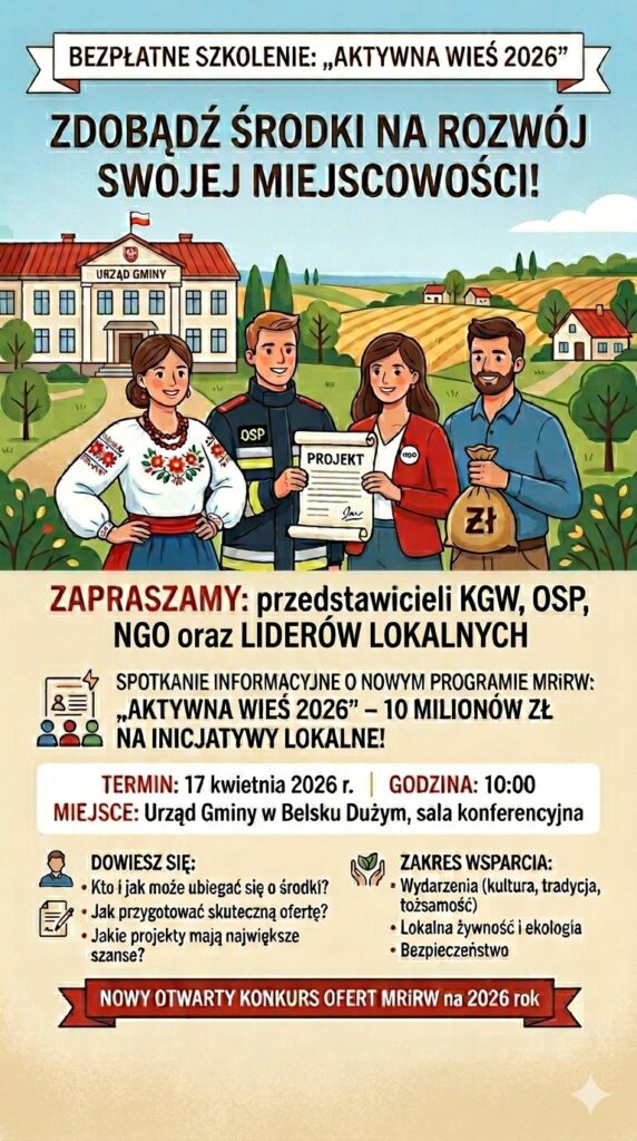 Zapraszamy przedstawicieli organizacji pozarządowych, kół gospodyń wiejskich, OSP oraz liderów lokalnych na spotkanie szkoleniowo-informacyjne dotyczące nowego programu Ministerstwa Rolnictwa i Rozwoju Wsi: „Aktywna Wieś 2026” – 10 milionów zł na inicjatywy lokalne!