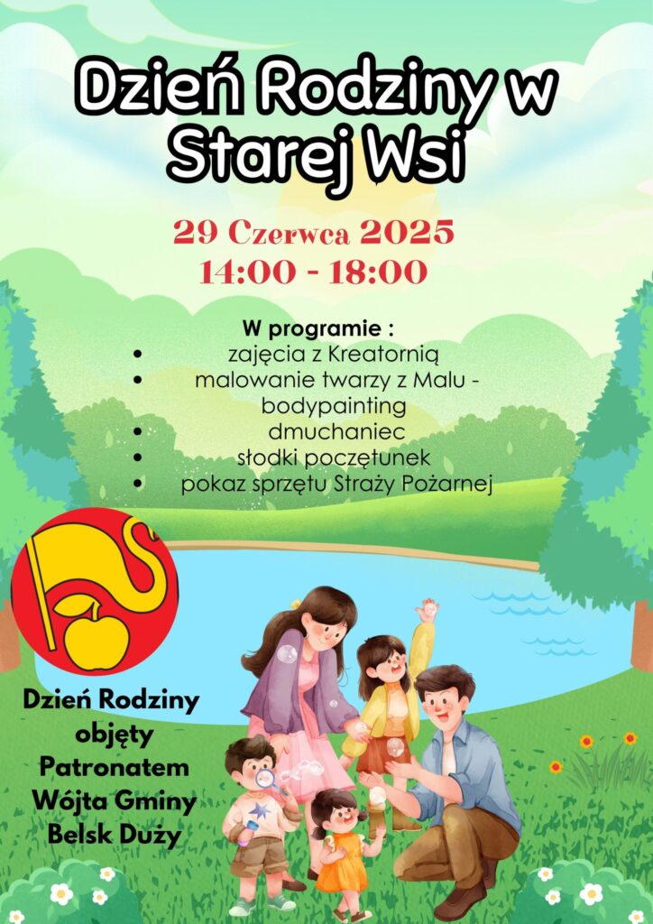Sołectwo Stara Wieś zaprasza na Dzień Rodziny, który odbędzie się w niedziele, 29 czerwca 2025 roku w godz. 14:00 – 18:00. Wydarzenie Patronatem Honorowym objął Wójt Gminy Belsk Duży – Władysław Piątkowski.