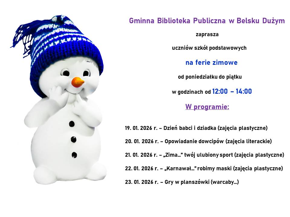 Gminna Biblioteka Publiczna w Belsku Dużym zaprasza w dniach 19-23 stycznia od poniedziałku do piątku w godz. 12:00 – 14:00. Podobnie będzie również w Lewiczynie. Z tym, że zajęcia trwać będą w godz. 10:00 – 12:00.