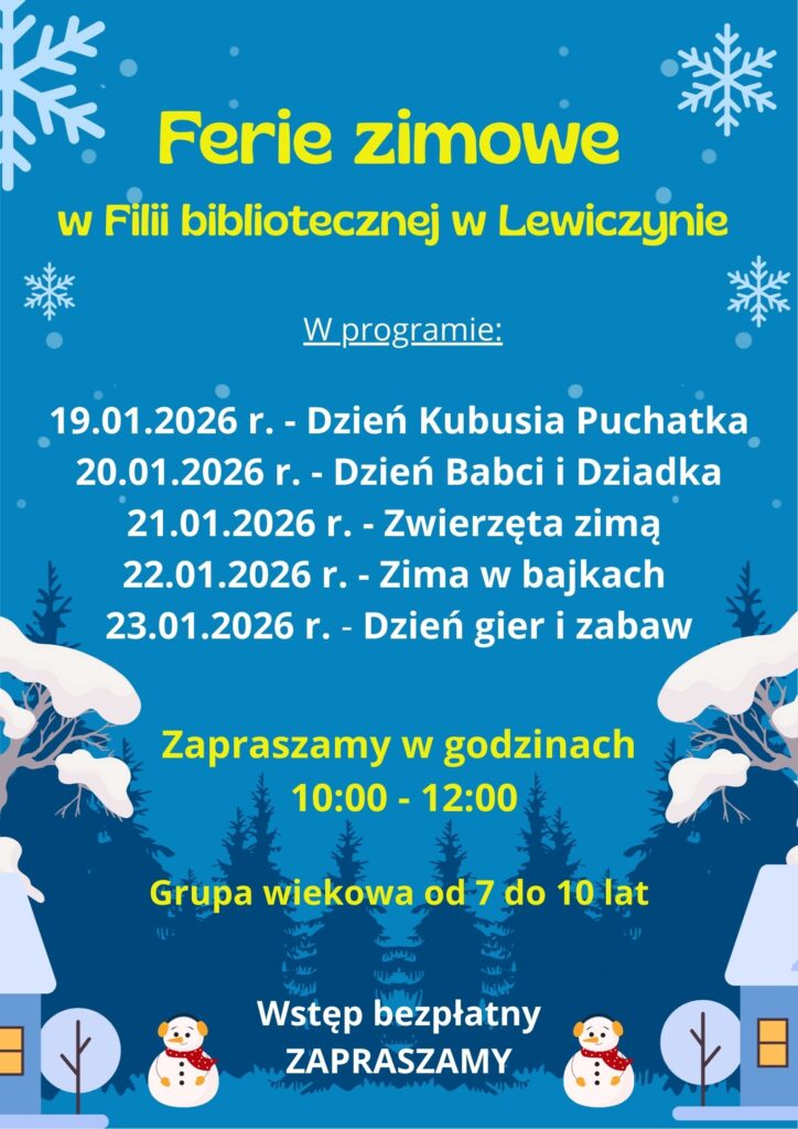 Natomiast podczas ferie zimowych w filii bibliotecznej w Lewiczynie odbędzie się Dzień Kubusia Puchatka, Dzień Babci i Dziadka, zwierzęta zimą, zima w bajkach oraz dzień gier i zabaw.