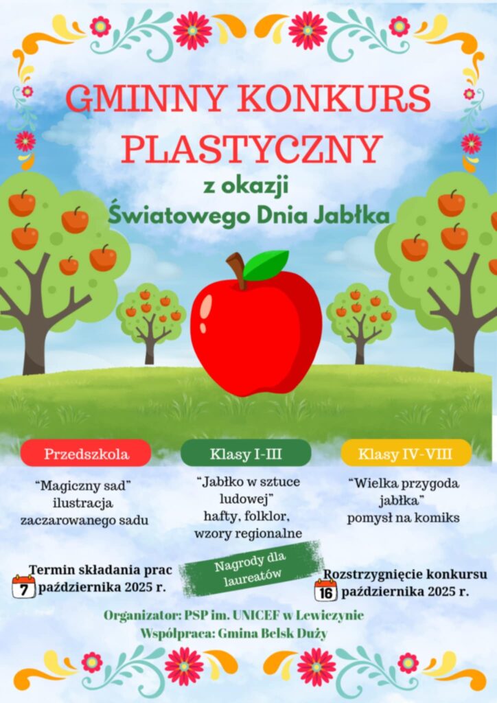 Publiczna Szkoła Podstawowa im. UNICEF w Lewiczynie zaprasza do udziału w Gminnym Konkursie Plastycznym z okazji Światowego Dnia Jabłka.