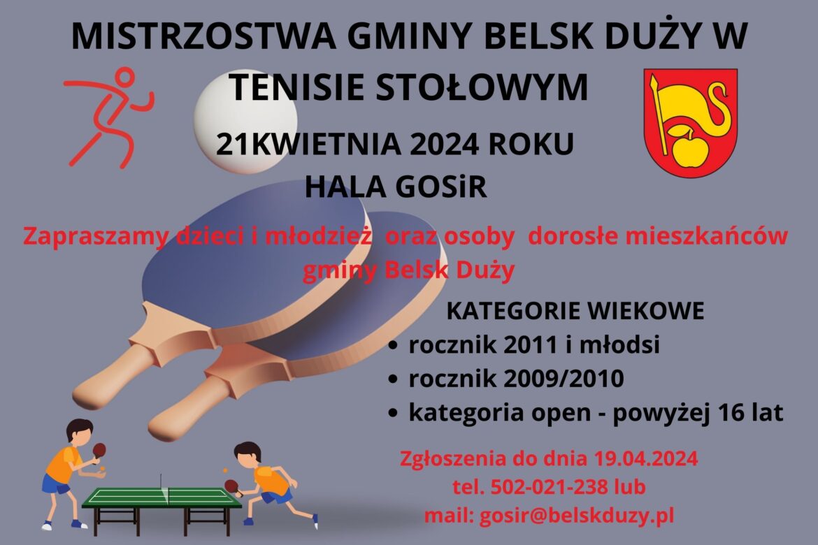 W niedzielę 21 kwietnia 2024 roku zapraszamy do hali GOSiR wszystkich sympatyków sportów indywidualnych na Mistrzostwa Belska Dużego w Tenisie Stołowym. Turniej adresowany jest do mieszkańców gminy Belsk Duży i rozegrany zostanie w trzech kategoriach wiekowych (szczegóły w regulaminie poniżej).