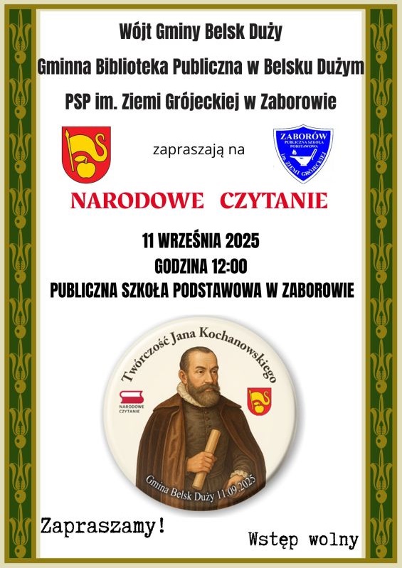 Wójt Gminy Belsk Duży, Gminna Biblioteka Publiczna w Belsku Dużym oraz PSP im. Ziemi Grójeckiej w Zaborowie zapraszają na Narodowe Czytanie. Odbędzie się ono 11 września 2025 roku o godz. 12:00 w PSP Zaborów.