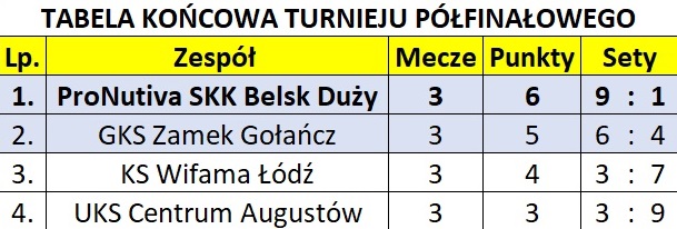 Belska hala sportowa była w dniach 12-14 kwietnia gospodarzem turnieju półfinałowego. W rywalizacji oprócz ProNutivy SKK Belsk Duży wystąpiły zespoły: KS Wifama Łódź (woj. łódzkie), GKS Zamek Gołańcz (woj. wielkopolskie) oraz UKS Centrum Augustów (woj. podlaskie).