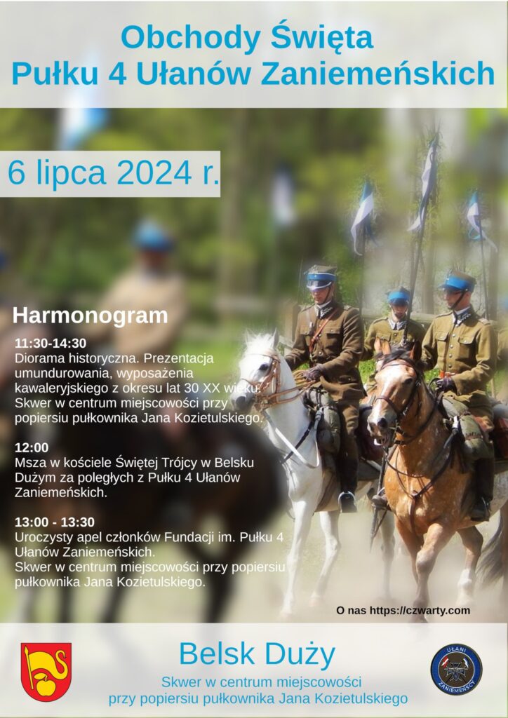 W imieniu organizatorów – Pułku 4 Ułanów Zaniemeńskich zapraszamy na uroczystości w Belsku Dużym! Odbędą się one w kościele parafialnym oraz na skwerze przy popiersiu płk. Jana Kozietulskiego w sobotę, 6 lipca 2024 roku od godz. 12:00.