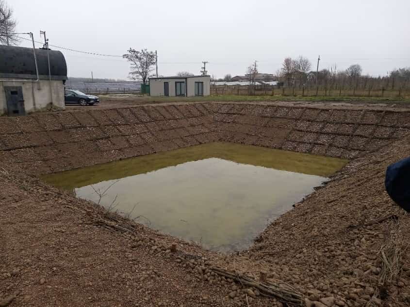 Minimalna odległość krawędzi czaszy stawu od granicy działki sąsiedniej nr ew. 95/2, wynosi 3,0 m. Skarpy stawu w celu zachowania ich stabilności zostały umocnione poprzez: umocnienie ich stopy kiszką faszynową Ø 20 cm, oraz umocnienie skarp narzutem kamiennym w płotkach na podkładzie z geowłókniny separacyjno-filtracyjnej 400 g/m2, do pełnej wysokości. Umocnienie brzegów wzdłuż linii brzegowej pasem szerokości 3,0 m, narzutem kamiennym na podkładzie z geowłókniny.