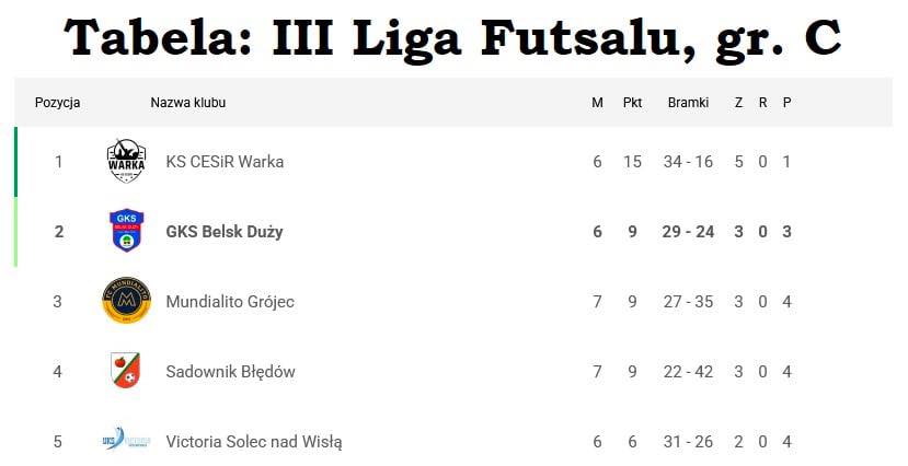 Po pewnym zwycięstwie nad lokalnym rywalem GKS Belsk Duży awansował na drugie miejsce w tabeli III Ligi Futsalu, grupa C. W przyszłą niedzielę, 8 lutego o godz. 18:30 w Grójcu podopiecznych Bogusława Cieślaka czeka arcyciekawy pojedynek derbowy z FC Mundialito. Zwycięzca prawdopodobnie weźmie udział w barażach o Final Four całych rozgrywek.