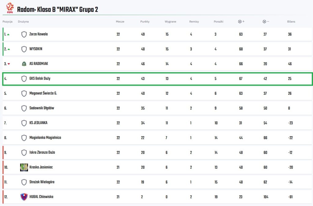 Finalnie GKS Belsk Duży sezon zakończył na czwartym miejscu z dorobkiem 43. punktów. Z promocji na wyższy szczebel rozgrywkowy cieszą się Zorza Kowala oraz KS Wysokin.