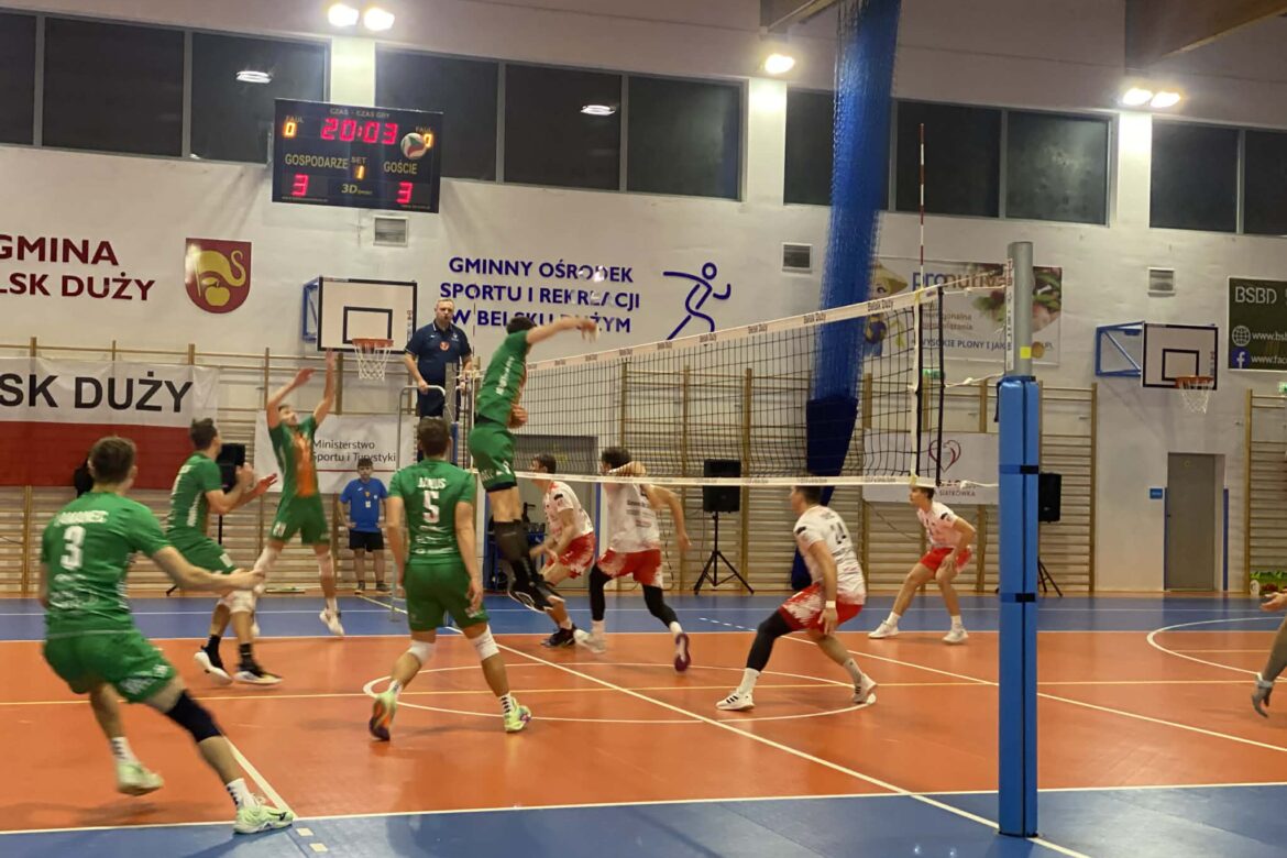 Pierwszoligowiec z Bielska-Białej osiągnął przewagę na początku pierwszego seta (6:4). Gracze z Belska Dużego grali jednak bardzo ambitnie i w połowie seta był remis (10:10). Niestety gorszy fragment sprawił, że goście znów wyszli na prowadzenie (14:16). Końcówka to pokaz jakości drużyny grającej o poziom wyżej, co poskutkowało dużą przewagą (17:23) i koniec końców wygraniem tej partii (19:25).