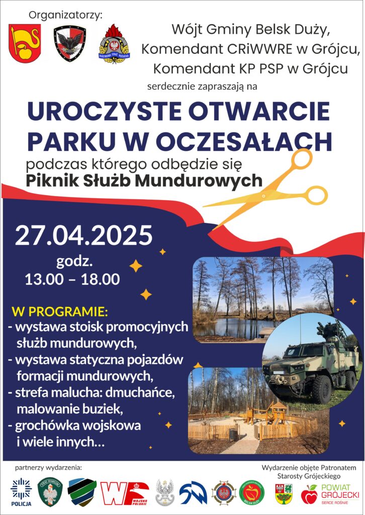 Wójt Gminy Belsk Duży, Komendant CRiWWRE oraz Komendant KP PSP w Grójcu zapraszają na uroczyste otwarcie Parku w Oczesałach podczas którego odbędzie się Piknik Służb Mundurowych. Wydarzenie już w niedzielę 27 kwietnia 2025 roku w godz. 13:00 – 18:00.