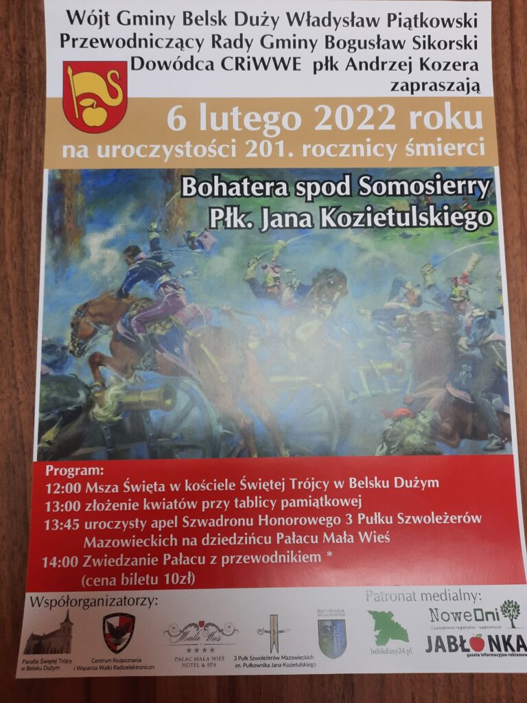 Wójt Gminy Belsk Duży – Władysław Piątkowski, Przewodniczący Rady Gminy – Bogusław Sikorski, a także Dowódca CRiWWE – płk Andrzej Kozera zapraszają na uroczystości 201. rocznicy śmierci bohatera spod Somosierry – płk. Jana Kozietulskiego. Odbędą się one w najbliższą niedzielę – 6 lutego 2022 roku w kościele parafialnym w Belsku Dużym.