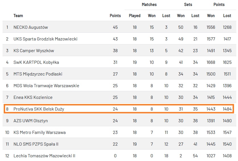 Dzięki sobotniej wygranej siatkarze belskiej ProNutivy z 24 punktami na koncie awansowali na 8 miejsce. Na cztery kolejki przed końcem sezonu zasadniczego sytuacja w ligowej tabeli jest na tyle skomplikowana, że żadna z drużyn od miejsca piątego nie może być pewna utrzymania. Kolejny mecz podopieczni trenera Karola Kościńskiego rozegrają w hali belskiego GOSiR-u w sobotę 1 marca, gdzie podejmą MTS Międzyczec Podlaski.