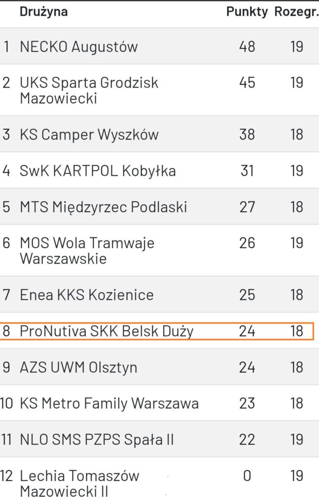 W dobrym położeniu są gracze Karola Kościńskiego. ProNutiva SKK Belsk Duży w najbliższą sobotę rozegra mecz przed własną publicznością. Ich przeciwnikiem będzie drużyna z Międzyrzecza Podlaskiego. Przy pewnym zwycięstwie belszczanie mogą wskoczyć nawet na 5. miejsce.