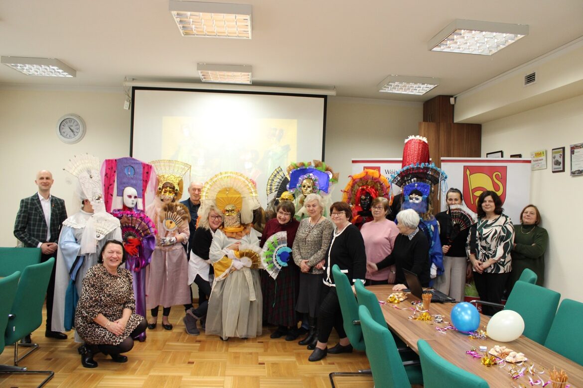 Spotkanie rozpoczęło się pokazem strojów karnawałowych, w które chętni uczestnicy spotkania mogli się przebrać i je zaprezentować. Każdy uczestnik spotkania mógł z bliska przyjrzeć się bogatym zdobieniom, pięknym kolorowym materiałom oraz maskom.