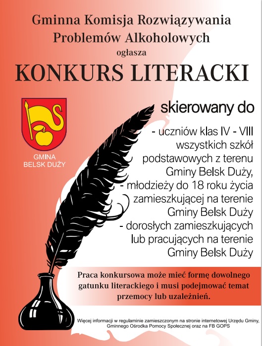 Gminna Komisja Rozwiązywania Problemów Alkoholowych ogłasza Konkurs Literacki skierowany do uczniów klas IV-VIII wszystkich szkół podstawowych z terenu Gminy Belsk Duży, młodzieży do 18 roku życia zamieszkującej na terenie Gminy Belsk Duży oraz dorosłych zamieszkujących lub pracujących na terenie Gminy Belsk Duży.