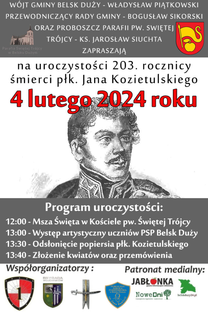 Wójt Gminy Belsk Duży – Władysław Piątkowski, Przewodniczący Rady Gminy – Bogusław Sikorski oraz Proboszcz Parafii pw. Świętej Trójcy w Belsku Dużym – ks. Jarosław Siuchta zapraszają na uroczystości 203. rocznicy śmierci płk. Jana Kozietulskiego. Odbędzie się ona w niedzielę, 4 lutego.