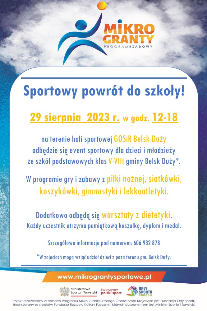 Zapraszamy dzieci i młodzież na Sportowy powrót do szkoły, który odbędzie się już 29 sierpnia w godz. 12-18 na terenie hali sportowej GOSiR Belsk Duży.