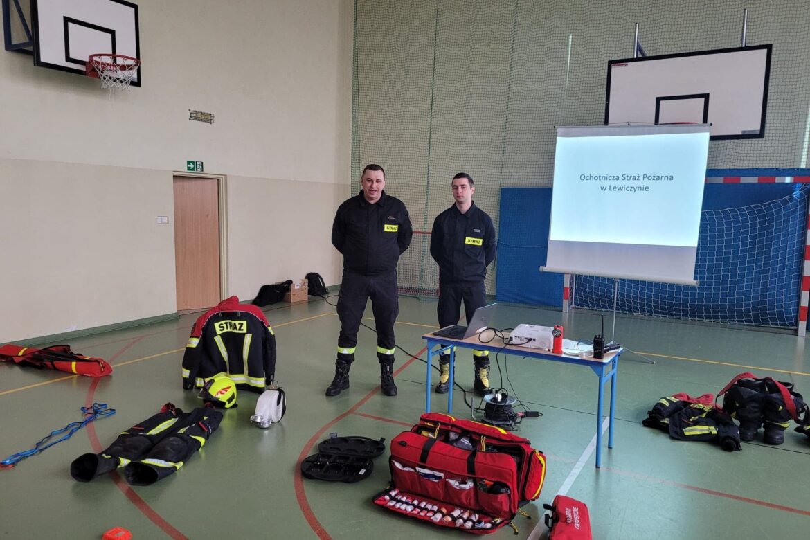 Druhowie: Wojciech Dominiak i Maciej Żukowski opowiadali o tym jak funkcjonuje lewiczyńska jednostka. Zainteresowane dzieci i młodzież dowiedziały się m.in. jak wzywać pomoc. Ponadto druhowie opowiadali o życiu społecznym OSP. Po prezentacji każdy z uczestników mógł obejrzeć, a także założyć znajdujący się na sali sprzęt strażacki.